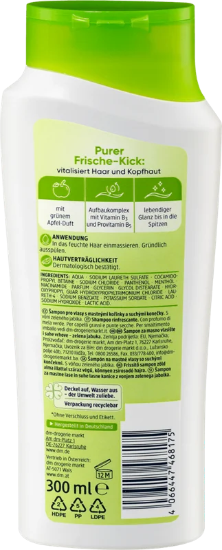 شامپو Balea Pure Freshness با رایحه سیب سبز و با ویتامین B3 و پروویتامین B5 مو و پوست سر را احیا می کند.