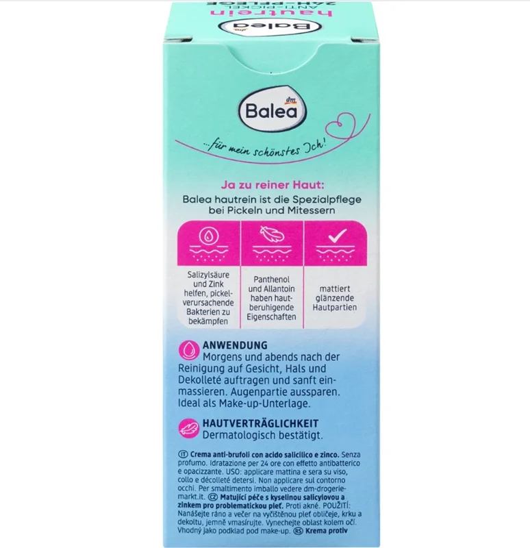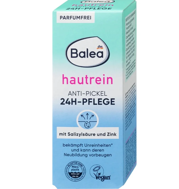 Hautrein Anti-Pimple 24h Care از Balea به عنوان مراقبت ویژه برای جوش ها و جوش های سرسیاه مناسب است. با مراقبت از صورت می تواند با جوش ها مقابله کند و از ایجاد جوش های جدید جلوگیری کند. در حالی که اسید سالیسیلیک و روی به مبارزه با باکتری های مولد جوش کمک می کنند، پانتنول و آلانتوئین دارای خواص تسکین دهنده پوست هستند. مراقبت ضد جوش همچنین می تواند نواحی براق پوست را مات کند*. بافت سبک و سریع جذب شده، رطوبت شدیدی را فراهم می کند