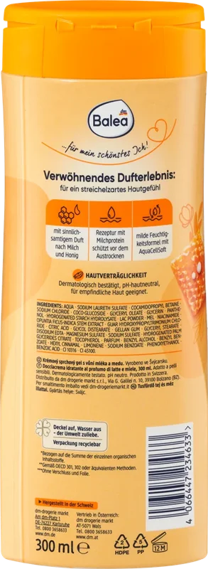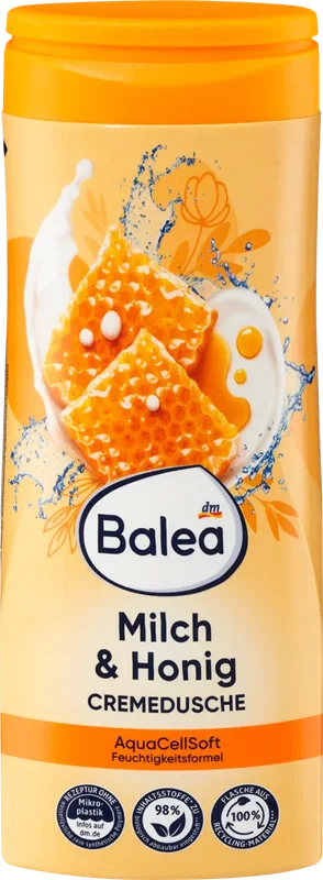 شامپو بدن کرمی شیر و عسل Balea به پوست شما احساس نرمی و لطافت می دهد و فرمول حاوی پروتئین شیر از پوست شما در برابر خشکی محافظت می کند و برای پوست های حساس مناسب است. دستور العمل بدون میکروپلاستیک و پلیمرهای محلول در آب، کاملا مصنوعی. بدنه بطری از مواد 100% بازیافتی (بدون درپوش و فویل) ساخته شده است