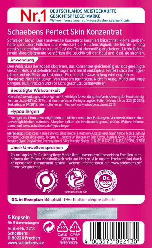 کنسانتره زیبایی پوست پرفکت شایبن با اسید هیالورونیک، فلفل سچوان و ویتامین E برای انواع پوست مناسب است. رنگ روشن آن با رنگ پوست سازگار است. چین و چروک ها را صاف می کند، درخشش پوست را زیاد می کند، منافذ را صاف می کند و اثر آرایشی سبک دارد. ایده آل برای مراقبت بعد از روز و به عنوان پایه آرایش عالی است