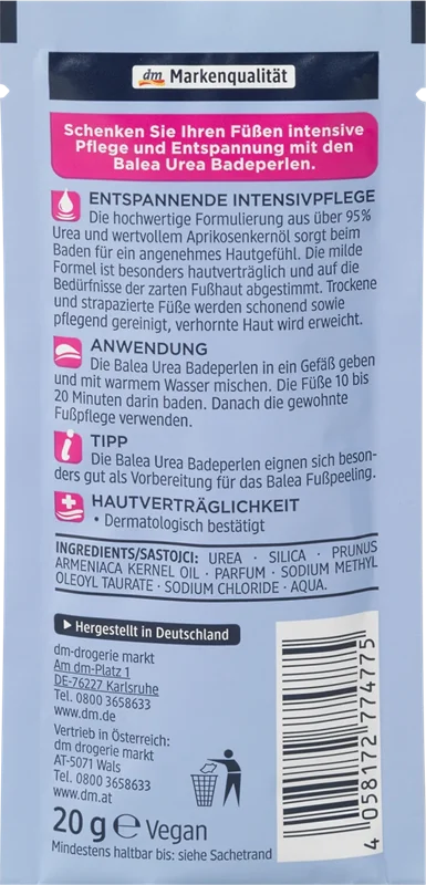 مروارید حمام Balea Urea را در ظرفی بریزید و با آب گرم مخلوط کنید. پاهای خود را به مدت 10 تا 20 دقیقه در آن قرار دهید. سپس از روال معمول مراقبت از پا استفاده کنید