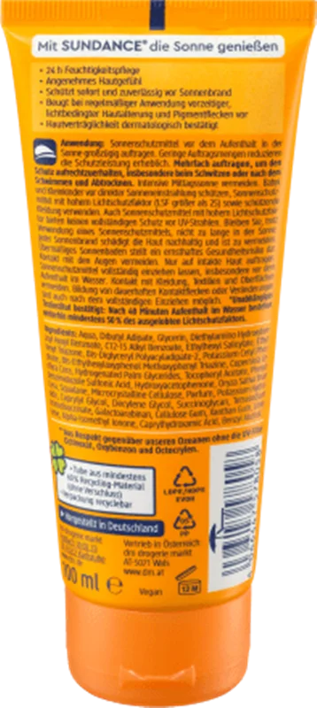 این کرم ضد آفتاب وگان با SPF 50 از برند SUNDANCE، که برای استفاده روی صورت و دکلته طراحی شده، یک مرطوبکننده ۲۴ ساعته است که احساسی دلپذیر بر روی پوست ایجاد میکند و به طور فوری از پوست در برابر آفتابسوختگی محافظت میکند. با استفاده مداوم، از پیری زودرس پوست ناشی از نور خورشید و تشکیل لکهای پیگمنتی جلوگیری میکند. سازگاری با پوست توسط متخصصین پوست تایید شده است. این محصول ضد آب است* (*یک موسسه تست مستقل تایید کرده که پس از ۴۰ دقیقه قرار گرفتن در آب، حداقل ۵۰٪ از فاکتور محافظتی اعلام شده همچنان باقی میماند). در راستای سازگاری نسبت به محیط زیست و حفاظت از اقیانوسها.، بدون استفاده از فیلترهای UV اکتینوکسات، اکسیبنزون و اکتوکریلن. وگان