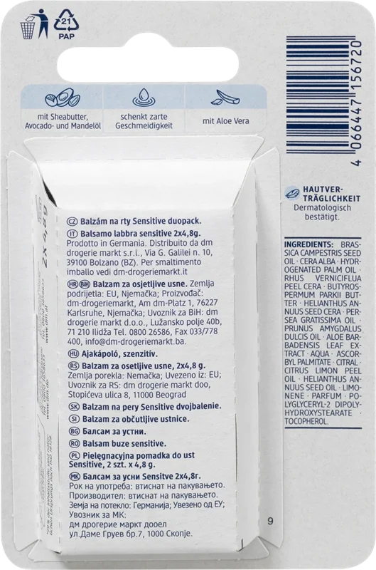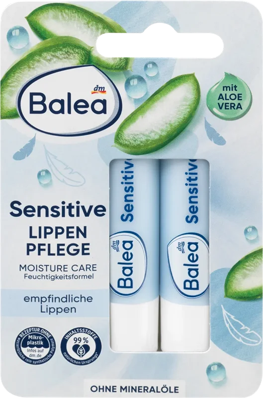 • Balea Lip Care Sensitive لطافت ظریفی را ارائه می دهد. با فرمول مراقبت ملایم و آلوئه ورا، مراقبت و محافظت را ارائه می دهد. آووکادوی گیاهی و روغن بادام باعث لطافت بیشتری می شود. بدون میکروپلاستیک و پلیمرهای محلول در آب، کاملا مصنوعی