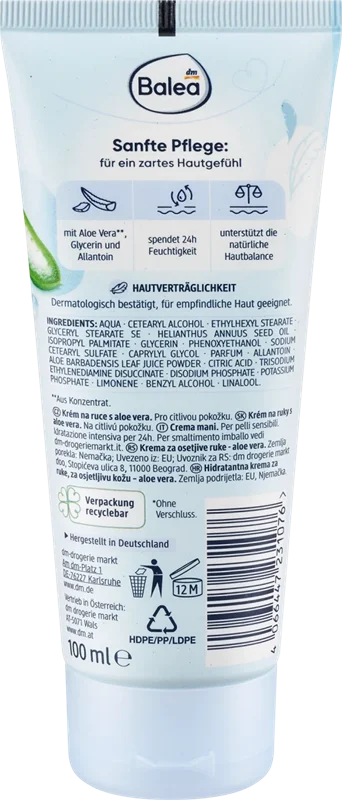 کرم دست Balea Sensitive مراقبت ایده آل برای پوست های خشک است. این کرم به طور خاص برای نیازهای پوست حساس طراحی شده است. فرمولاسیون حاوی آلوئه ورا و گلیسیرین رطوبت بالایی را به مدت 24 ساعت فراهم می کند و پوست را نرم می کند. دستور العمل بدون میکروپلاستیک و پلیمرهای محلول در آب، کاملا مصنوعی