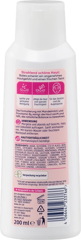 شیر پاک کننده ملایم Balea یک پاک کننده سبک و کرمی برای صورت و دور چشم - برای هر روز است. فرمولاسیون بسیار ملایم با شیر بادام و پروویتامین B5 پوست را تغذیه می کند، مرطوب می کند و به حفظ تعادل طبیعی آن کمک می کند. پوست به آرامی از آرایش، آلودگی و رسوبات پاک می شود. 92 درصد از مواد مورد استفاده از جمله آب منشاء طبیعی دارند.