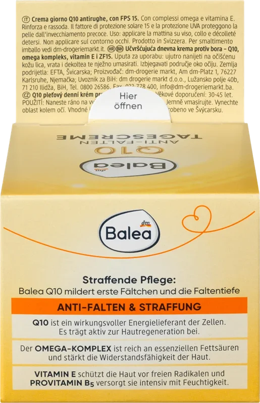 کرم روز Balea Q10 چین و چروک ها و عمق چین و چروک ها را کاهش میدهد. Q10 تامین کننده انرژی موثر برای سلول ها است. به طور فعال به بازسازی پوست کمک می کند. امگا کمپلکس سرشار از اسیدهای چرب ضروری است و انعطاف پذیری پوست را تقویت می کند. ویتامین E از پوست در برابر رادیکال های آزاد محافظت می کند و پروویتامین B5 رطوبت شدیدی برای آن فراهم می کند. SPF 30 و محافظت در برابر اشعه ماوراء بنفش محافظت بیشتری در برابر پیری زودرس پوست ایجاد می کند. از ایجاد لکه های رنگدانه مرتبط با نور خورشید جلوگیری می شود.