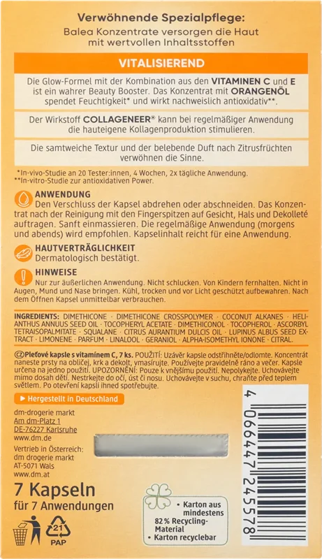 کنسانتره ویتامین C Balea یک محصول مراقبت ویژه با خواص فعال است و مواد با ارزشی را برای پوست فراهم می کند. کنسانتره مراقبتی احیا کننده حاوی ویتامین C و E یک تقویت کننده واقعی زیبایی است. فرمول درخشندگی با روغن پرتقال رطوبت و اثر آنتی اکسیدانی اثبات شده را فراهم می کند. ماده فعال Collageneer® می تواند تولید کلاژن خود پوست را در صورت استفاده منظم تحریک کند. بافت نرم و مخملی و رایحه نشاط آور مرکبات حواس را تقویت می کند.