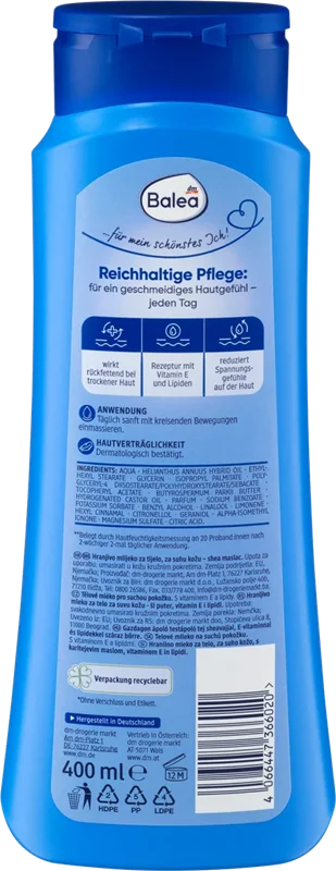 شیر بدن غنی از Balea رطوبت فراوانی را به پوست خشک باز می گرداند. در عین حال، فرمول دارای یک اثر مرطوب کننده است - برای احساس صافی قابل توجهی در پوست. فرمول مغذی با لیپیدهای منتخب، ویتامین E و کره شی، احساس زبری و خشکی پوست را کاهش می دهد و فرمول Moisture Care 48 ساعته از تامین رطوبت طبیعی پوست پشتیبانی می کند و از خشکی آن محافظت می کند. امولسیون غنی پوست را به شدت تغذیه می کند و احساس تنش را کاهش می دهد. دستور العمل بدون میکروپلاستیک و پلیمرهای محلول در آب.
