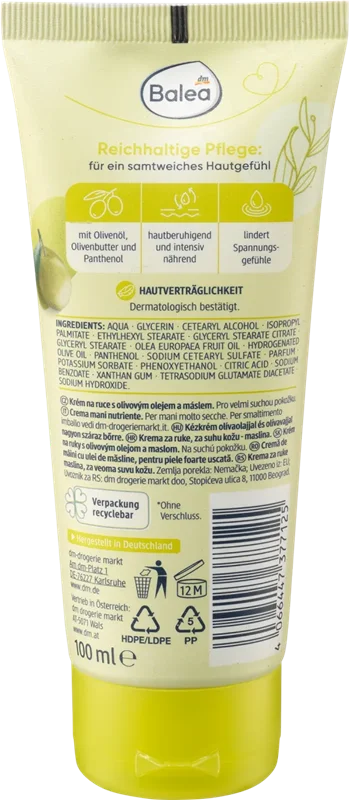 کرم دست Balea دستان شما را نرم و لطیف نگه می دارد. فرمول مراقبتی پوست خشک را تغذیه میکند و احساس تنش را کاهش میدهد. مواد تشکیل دهنده با روغن زیتون طبیعی، کره زیتون با ارزش و پانتنول، پوست را به شدت تغذیه می کند. دستور العمل بدون میکروپلاستیک و پلیمرهای محلول در آب، کاملا مصنوعی