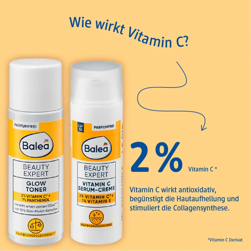 Balea Beauty Expert مراقبت موثری را با مواد غلیظ و متناسب با نیازهای پوست ارائه می دهد. DUO VITAMIN C COMPLEX - ساخته شده از اتیل اسکوربیک اسید و اسکوربیل گلوکزید - دارای اثر آنتی اکسیدانی و روشن کننده پوست است و سنتز کلاژن را تحریک می کند. پانتنول اثر آرام بخش دارد و گلیسیرین از تعادل رطوبت پوست حمایت می کند. فرمول حاوی 10% کمپلکس مرطوب پوست - با 1% پانتنول، 3% بتائین، 2.9% گلیسیرین و 3.1% مرطوب کننده - رطوبت شدیدی را به مدت ۲۴ ساعت برای پوست فراهم می کند