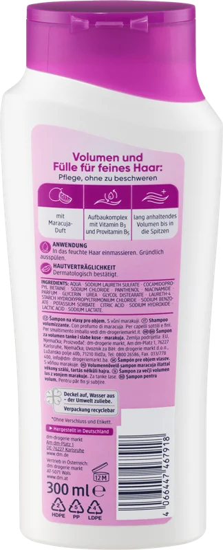 شامپو حجم دهنده Balea به موهای نازک و ظریف استحکام می بخشد و بدون سنگین کردن آن ها را تغذیه می کند. ویتامین B3 و پروویتامین B5، لطافت و حجم طولانی مدت را تضمین می کند.